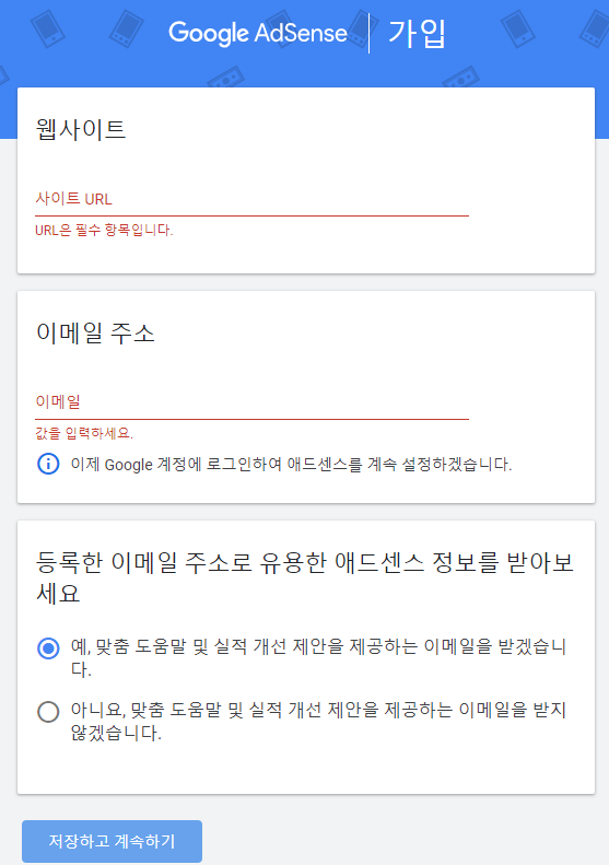 | 2) 필수 항목 입력 - 사이트 URL : 블로그 주소 등 - 이메일 주소 : 본인의 자주 사용 이메일 |